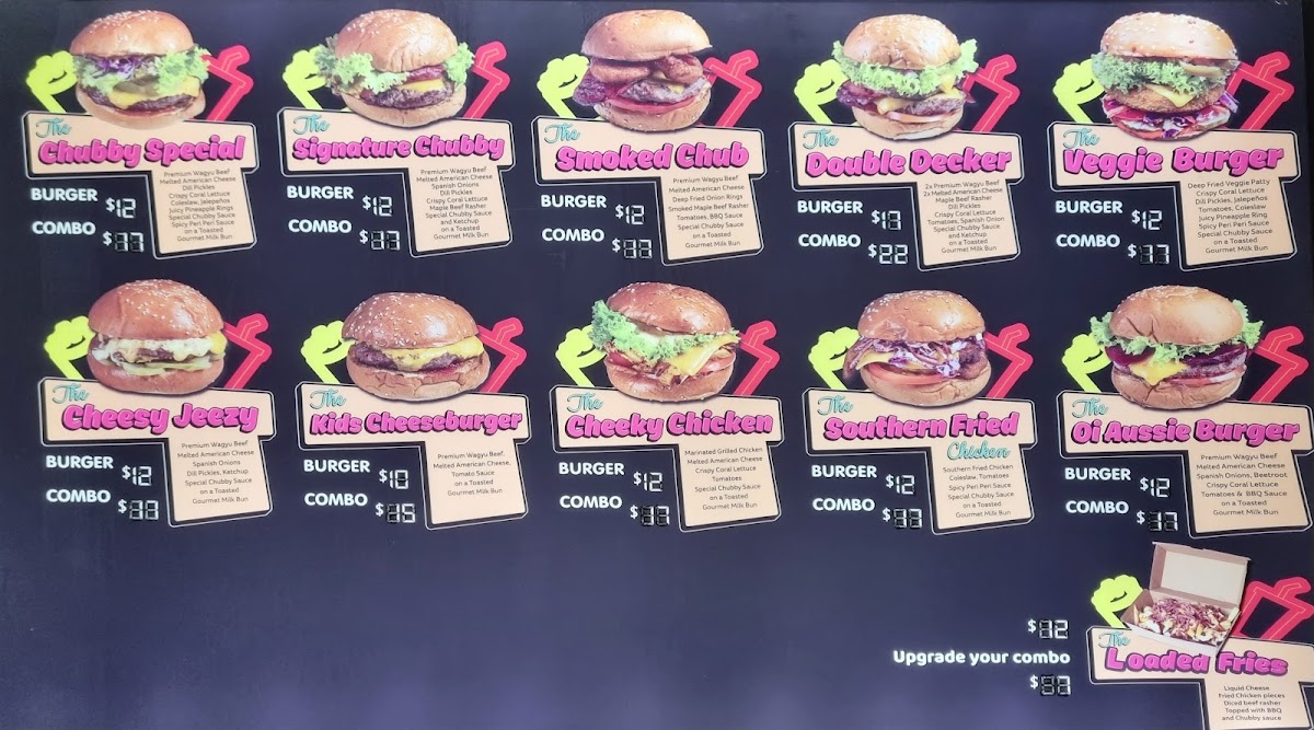 Welcome to Chubby Buns Burgers, where your taste buds are in for a real treat! Located at 1600 Canterbury Rd, Punchbowl NSW 2196, our menu is a burger lover's paradise, showcasing a mouth-watering selection that promises to satisfy every craving. Dive into our Loaded Fries, perfect for sharing (or not!), and don't miss out on our signature Beef Burger, featuring juicy patties and fresh toppings. If you're feeling adventurous, try The Double Decker Burger or the irresistible Cheeky Chicken Grilled Burger Combo. For those craving something truly special, The Chubby Special Burger won't disappoint! Plus, each combo is crafted with loveāfrom the Cheesy Fries to the Smoke Burger Combo. Don't forget our Wagyu Burger for the ultimate indulgence. Whether you're dining in or taking away, the